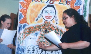 For non-artists, cantastoria creation workshops are incredibly flexible, because creating a cantastoria involves story telling, analysis of issues, and painting and performing, and thus can involve people with all sorts of different strengths, from the shy bookworm to the constant doodler to the gregarious chatterbox who couldn’t draw to save his life. It allows people to tell their own stories in a creative and multi-layered way that leaves room for all participants to contribute. This makes it a very useful tool in workshops whose goal is simple show-creation with diverse populations. Cantastoria creation can serve an alternate and fresh way for teachers to approach subject matter, a tool for activists to communicate their message, and as a collective activity which unifies communities around a common interest.